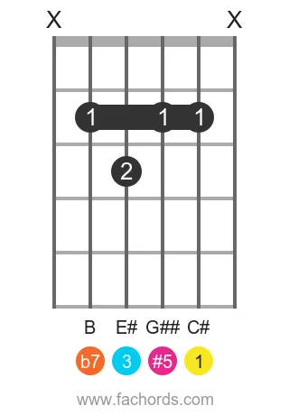 The C# 7(#5) chord is built from four specific notes: C# (the Root), E# (the Major Third), G## (the Augmented Fifth), and B (the Minor Seventh).
