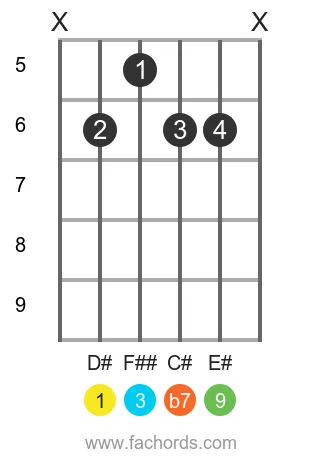 The D#9 chord is built from five distinct notes: D# (the Root), F## (the Major Third), A# (the Perfect Fifth), C# (the Minor Seventh), and E# (the Major Ninth). These notes correspond directly to the chord's defining intervals.